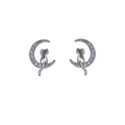 Pendientes de presión gato con luna en plata y plata bañada en oro, adonado con pequeñas circonitas blancas